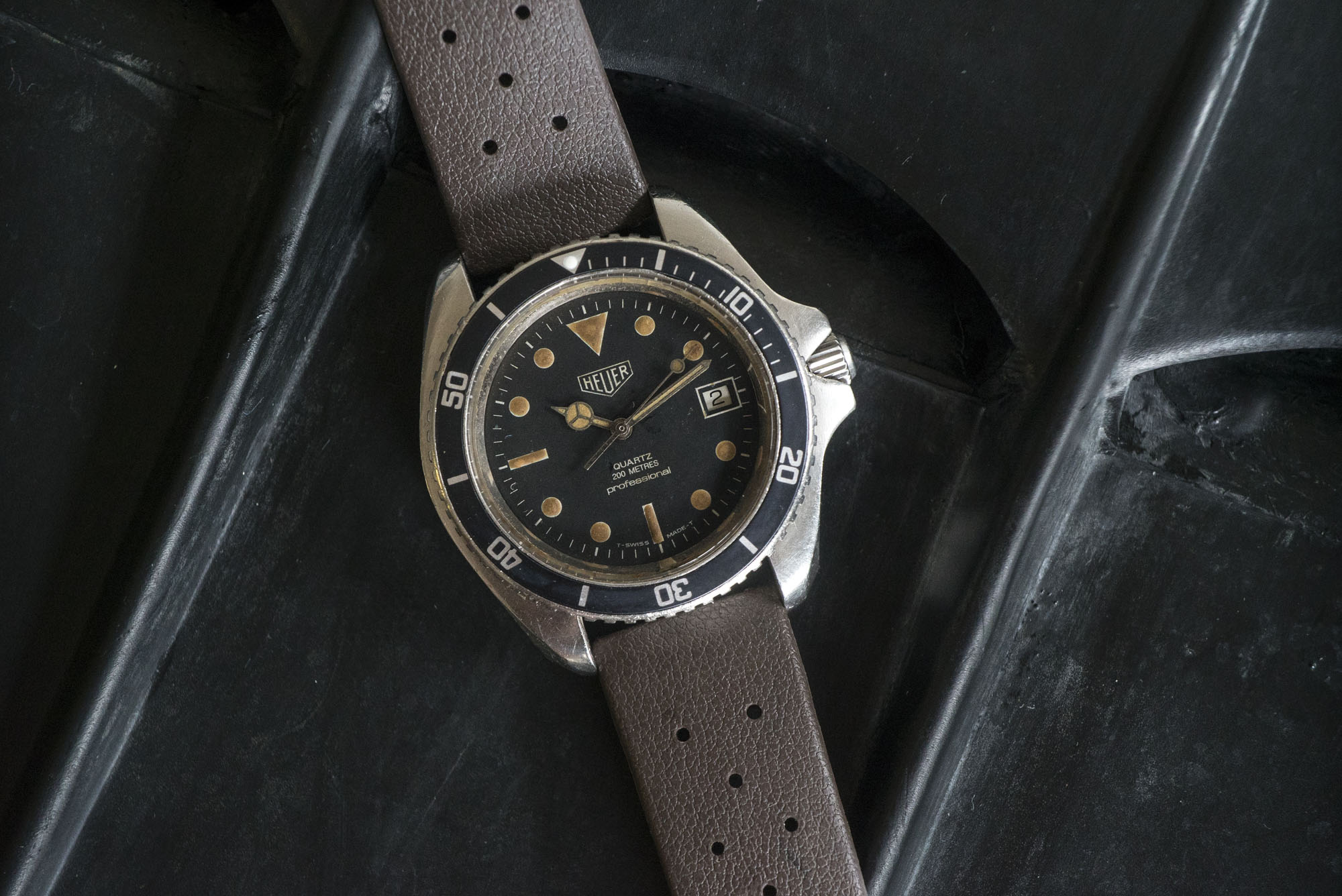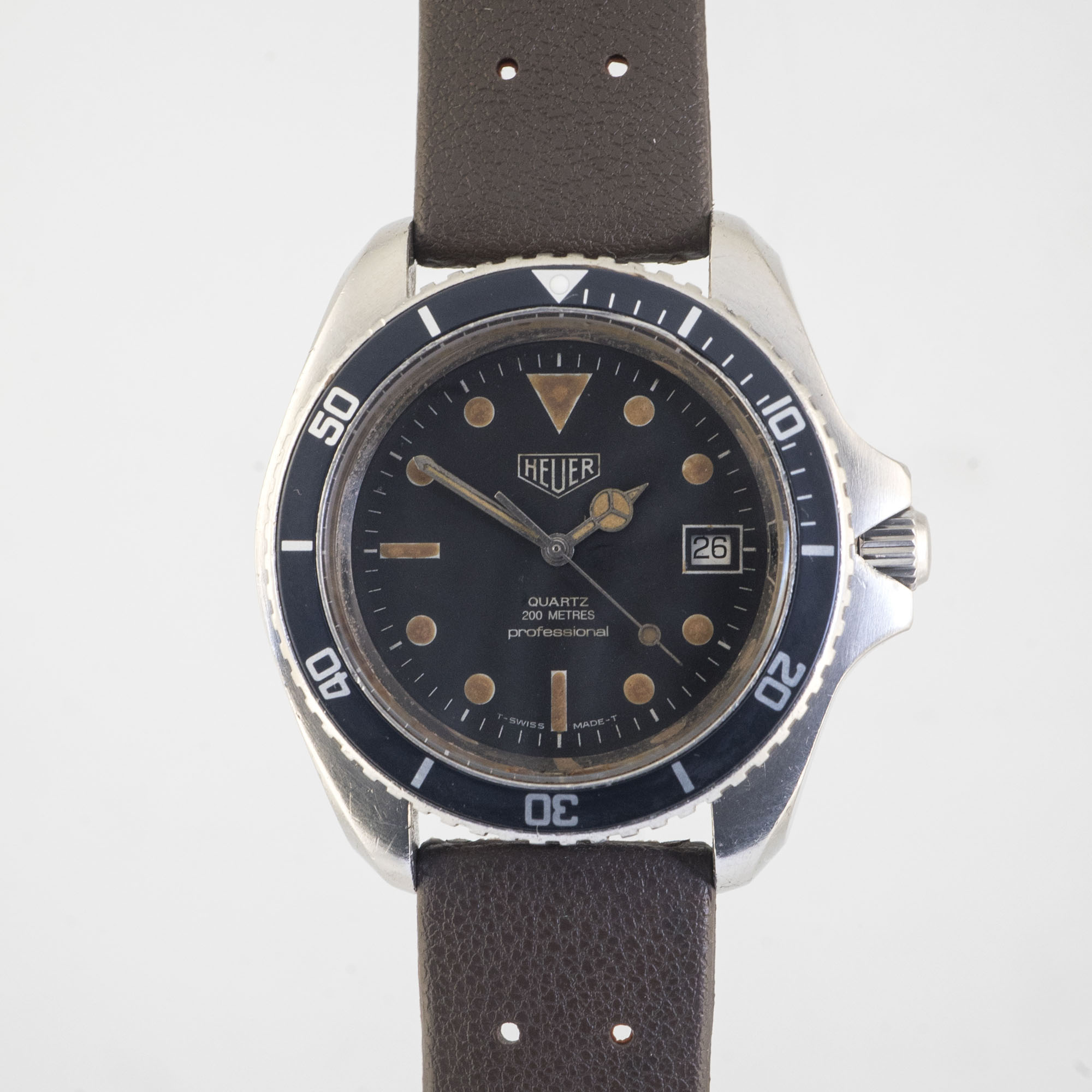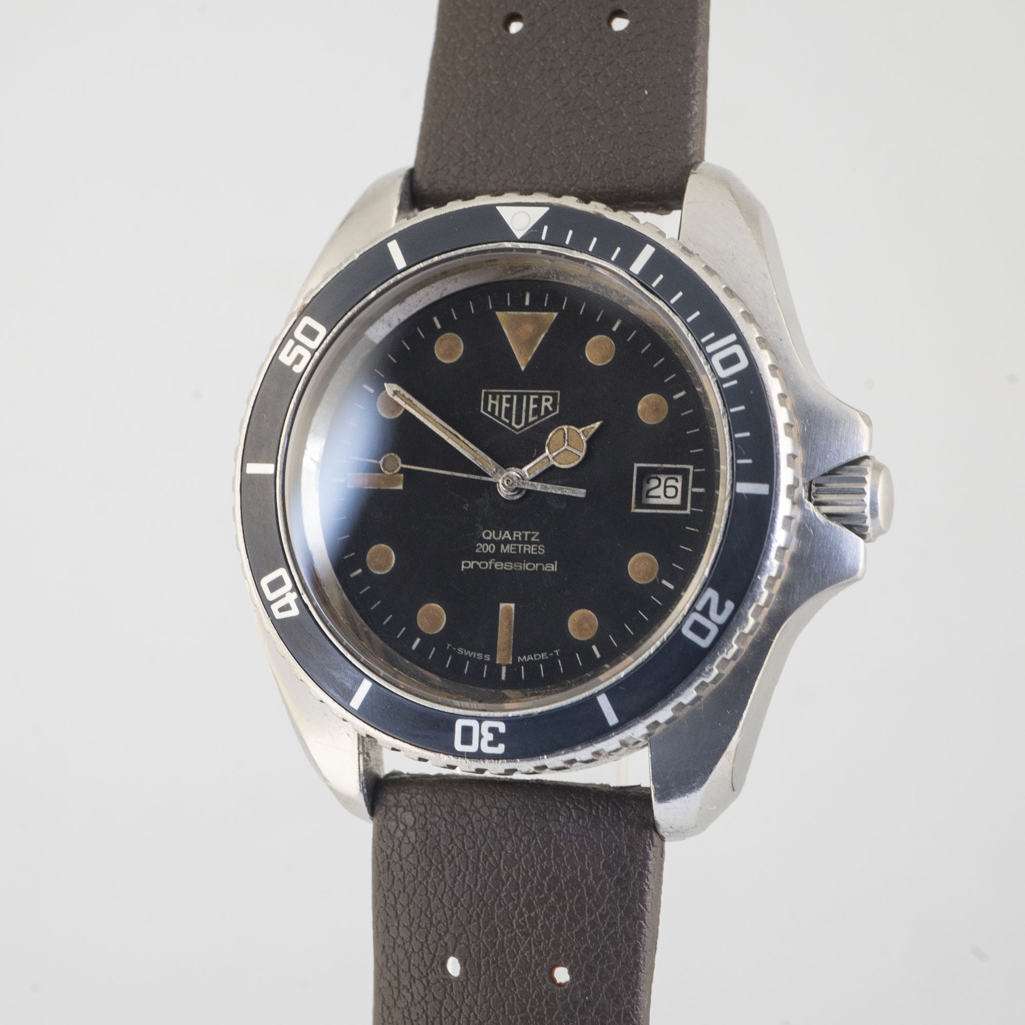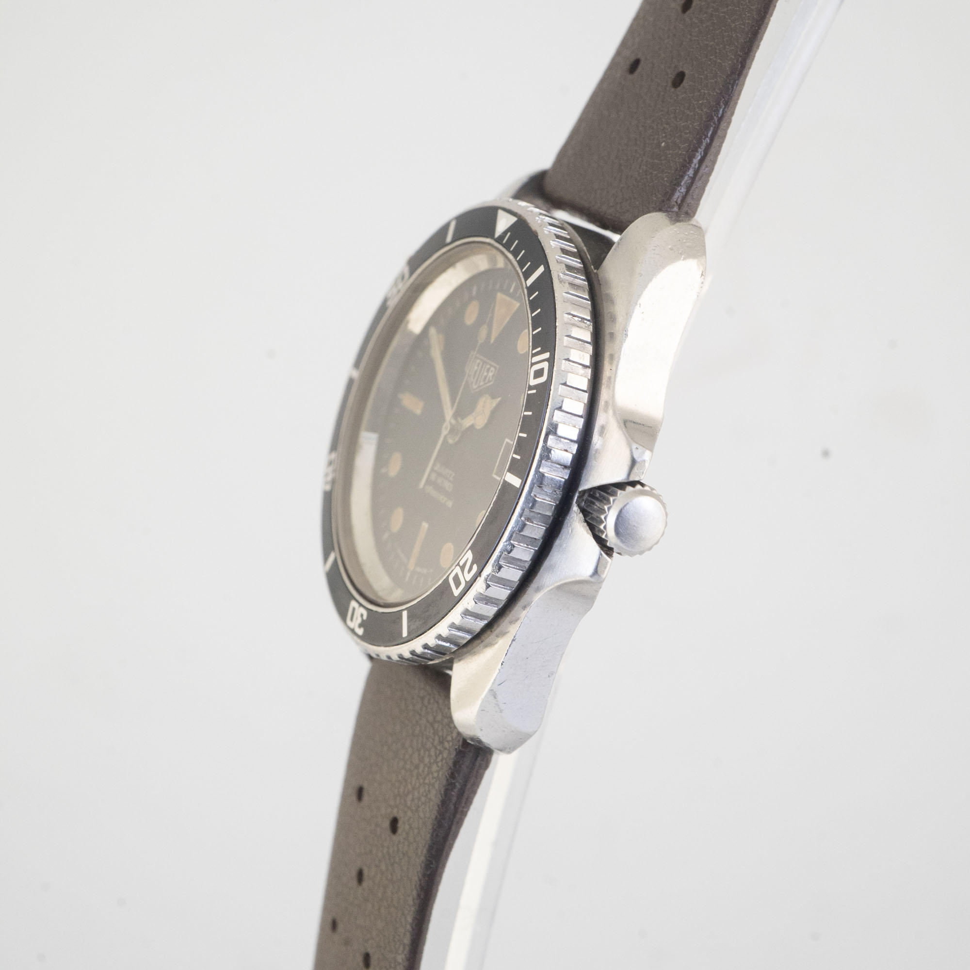 Heuer almost needs no introduction, as it still exists as the present Tag Heuer. It was almost waylaid along with a lot of Swiss brands during the quartz crisis but was saved when it decided to join the quartz bandwagon and it created a very appealing diver’s watch. The first generation is coded as the 844 and was made in France. This is the second generation with manufacturing already reverting to Switzerland, the 980.006. This example has developed the most appealing kind of original lume patina with a mottled coffee look, perhaps because it led a hard life in the tropics and seems to have had some moisture ingress at one point in its life. It comes with a vintage brown Tropic style strap.