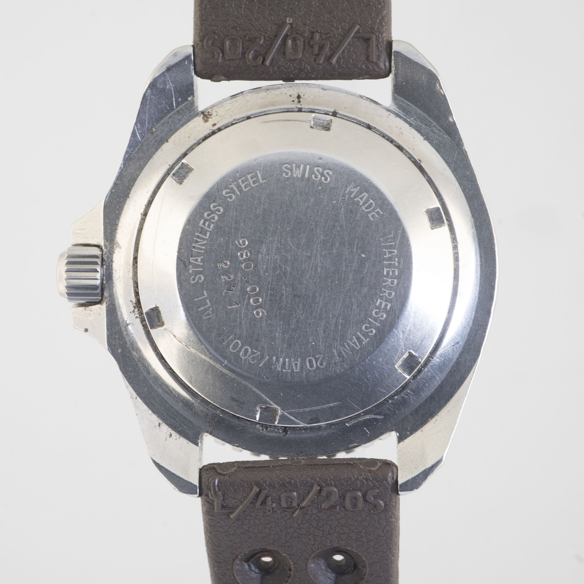 This quartz workhorse is running well. Crystal has been upgraded to Sapphire and bezel insert is an excellently reproduced replacement. Both original mineral crystal and well-worn insert will be included in the sale. As indicated above the dial has some moisture marks that we chose not to touch and the quartz movement has traces of oxidation. Case has obvious usage scratches and seems to be unpolished.