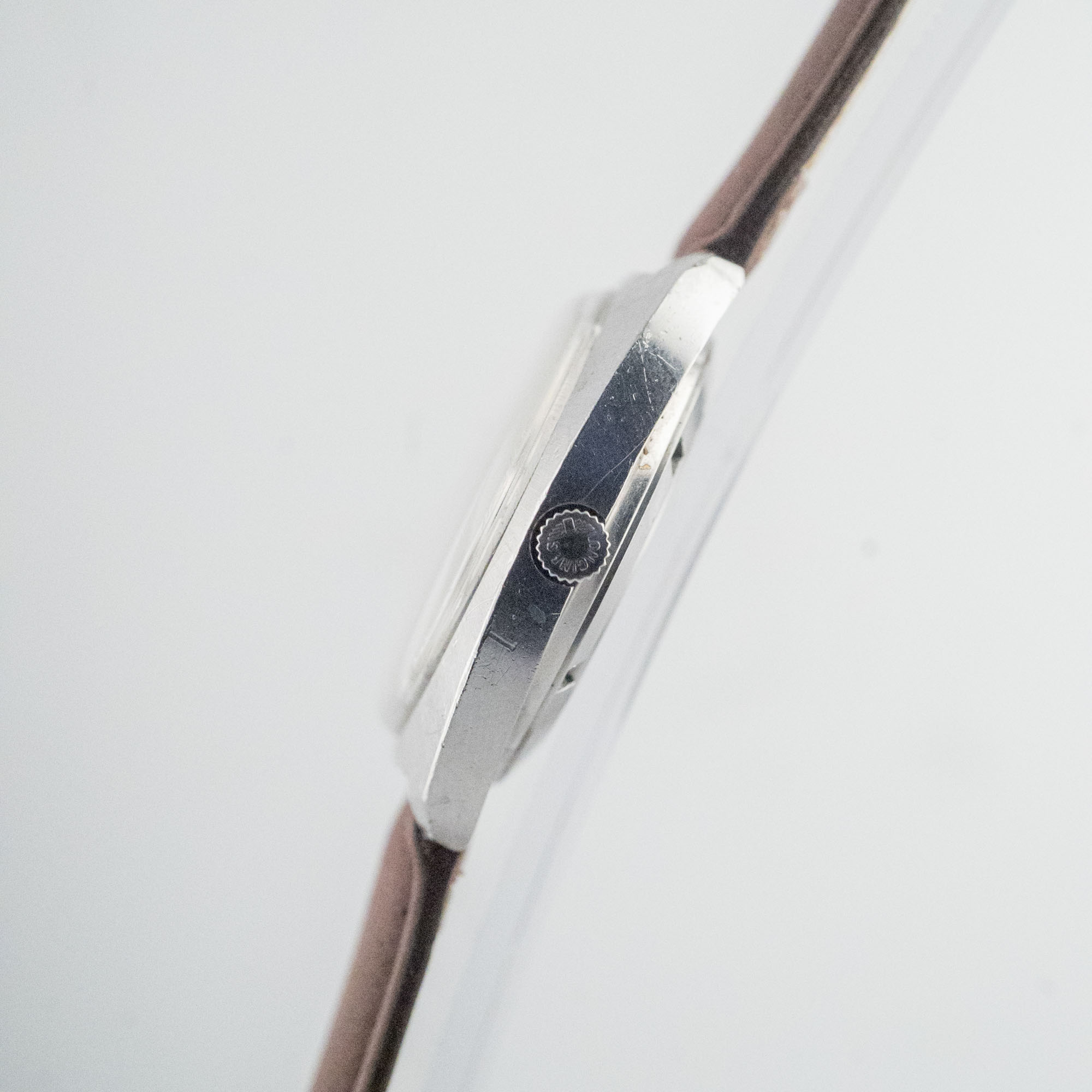 This watch with the nice linen dial is the second version of the Ultra-Chron which beats at 28000bph and is in an unpolished case with brush marks still apparent and beveling on the lugs still sharp. One detail that really stands out for us is the asymmetric and offset date window that makes this watch look special.